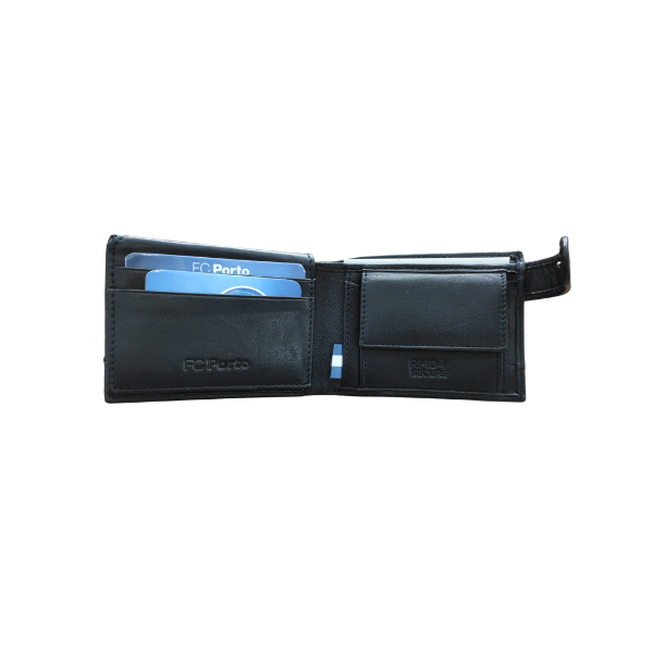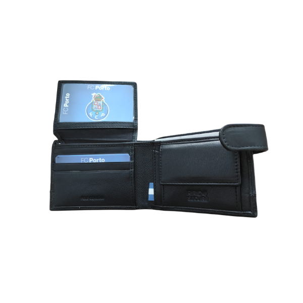 Ranhuras para cartões e uma aba com janela para documentos com foto.