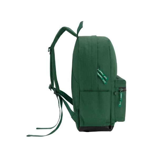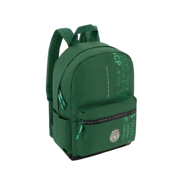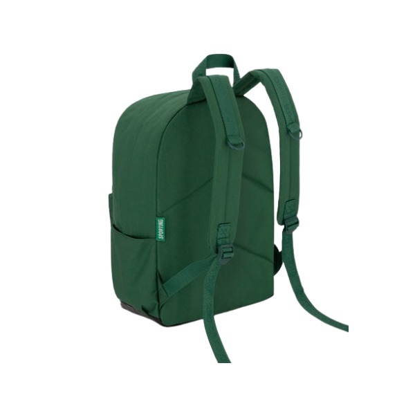 Mochila Sporting CP. Design escolar e funcional, em poliéster verde resistente. Base em  napa preta.