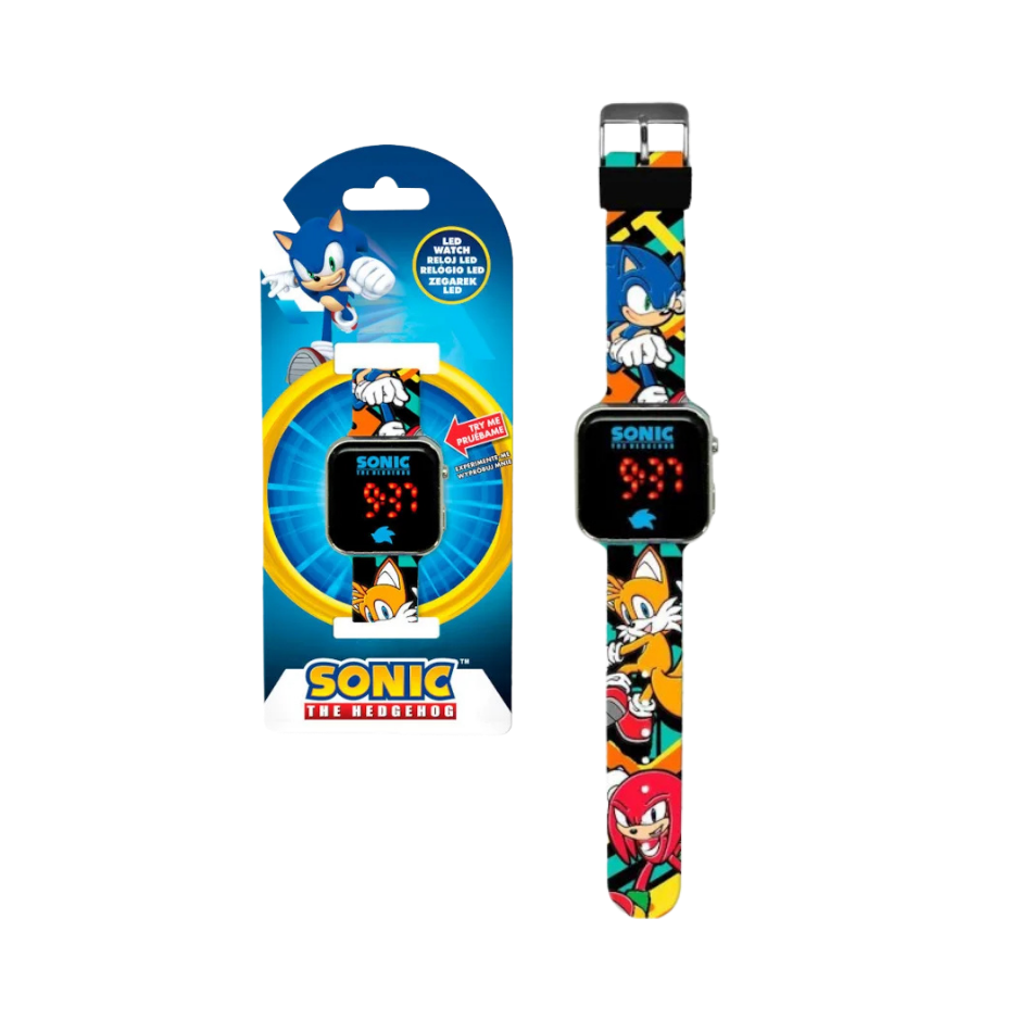 Relógio Digital LED Sonic, possui revestimento de alumínio e bracelete de plástico com funcionamento digital LED e ilustrações Sonic.